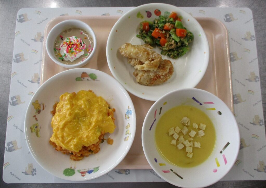 🎂12月のお誕生会がありました🎂2025-12-19 お知らせ12月18日(木)、お誕生会がありました。様子はこちら⇒誕生会メニューオムライス、塩唐揚げ、ブロッコリーサラダコーンスープ、キャラメルプリンおやつは、ホットケーキでした。おいしかったね😊😊😊